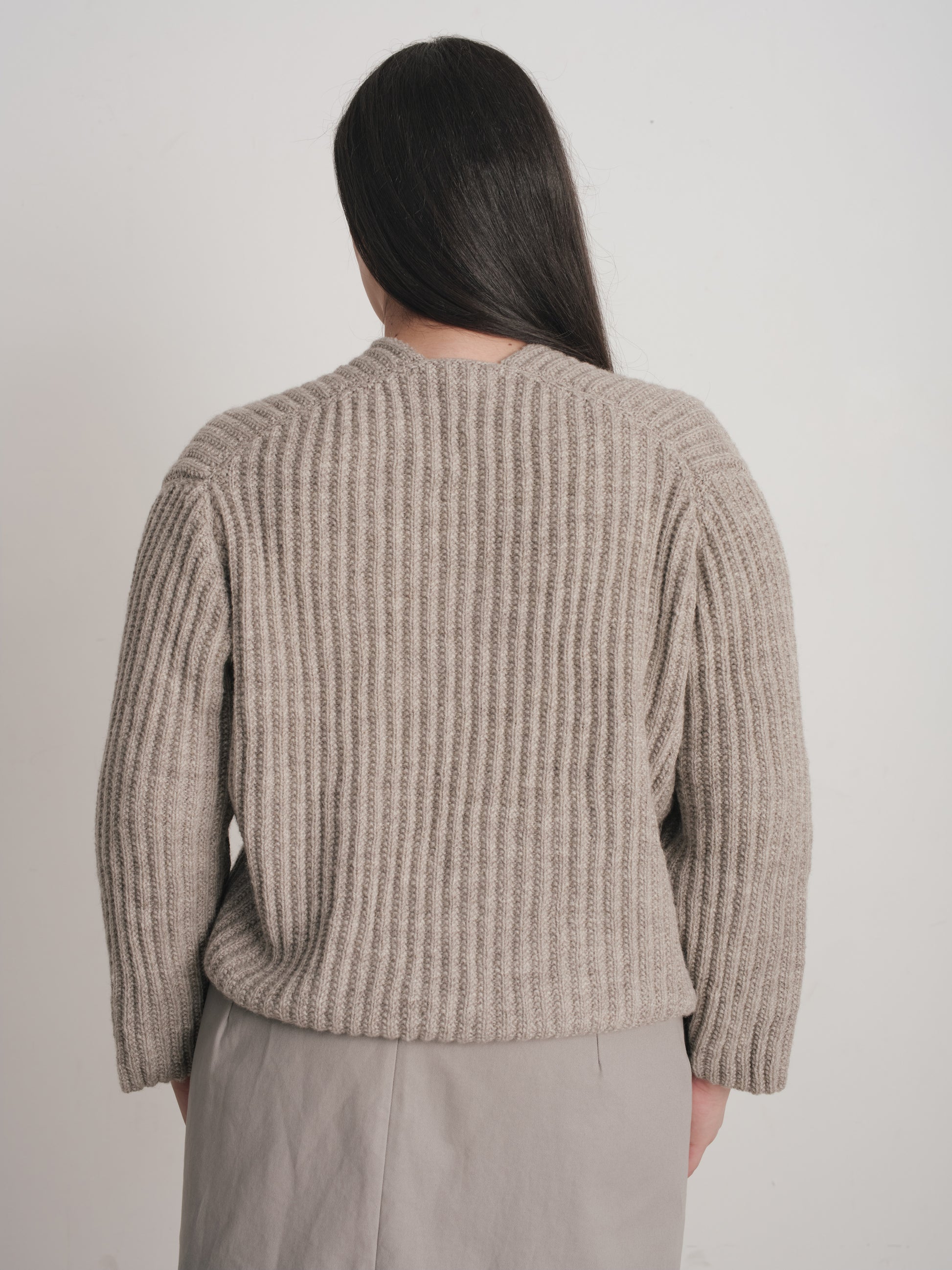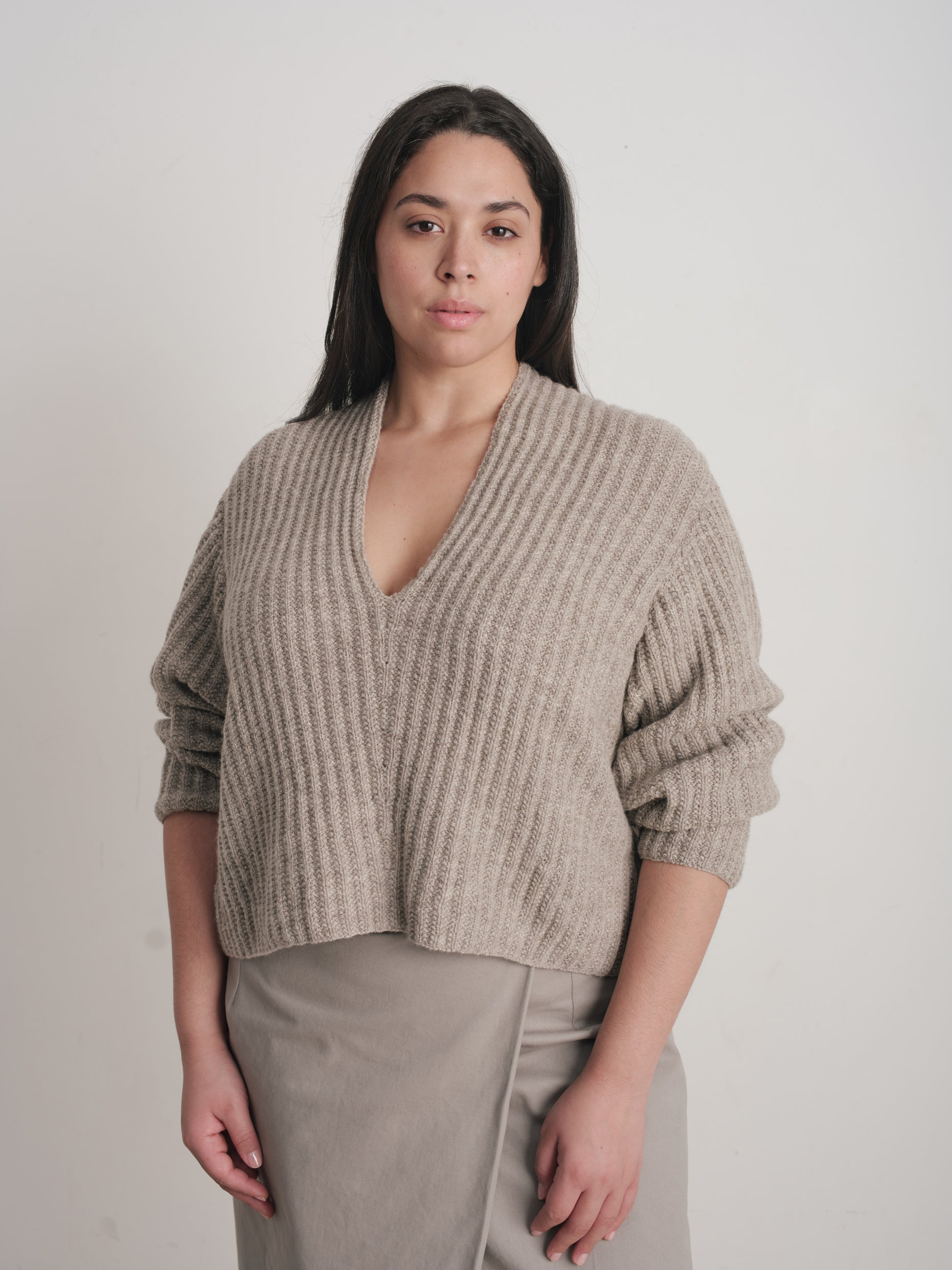 Cassie is wearing a size XL in Good Wool from Purl Soho in color Driftwood Gray. Her measurements are : 43"/34"/44.5" at 5'9".