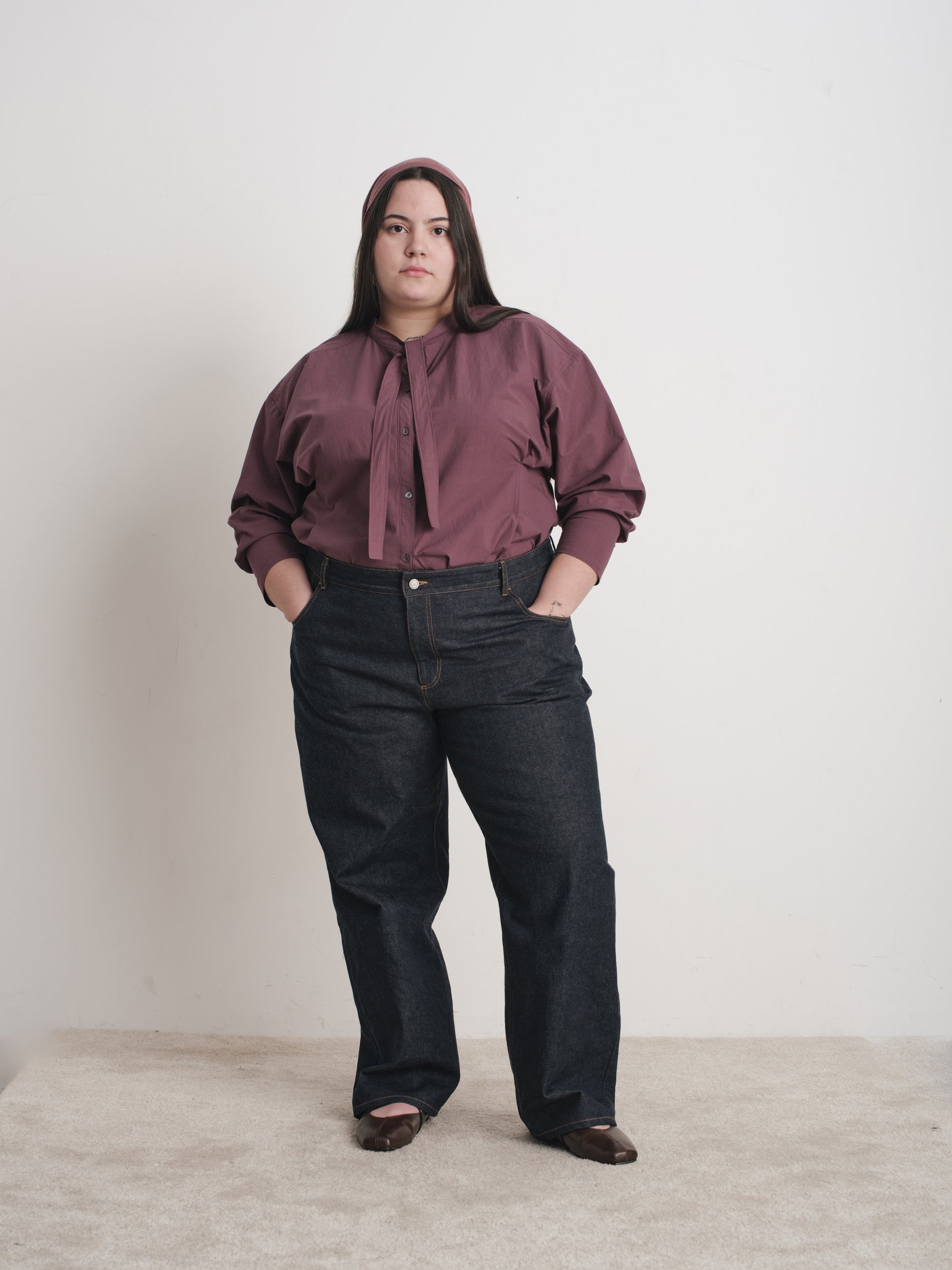 Katelynn is wearing a size 26 from the JJ size range in a 11oz 100% Cotton St. James Denim from Capital Fabric Supply in color Indigo. Her measurements are : 53"/44"/56" at 5'7".