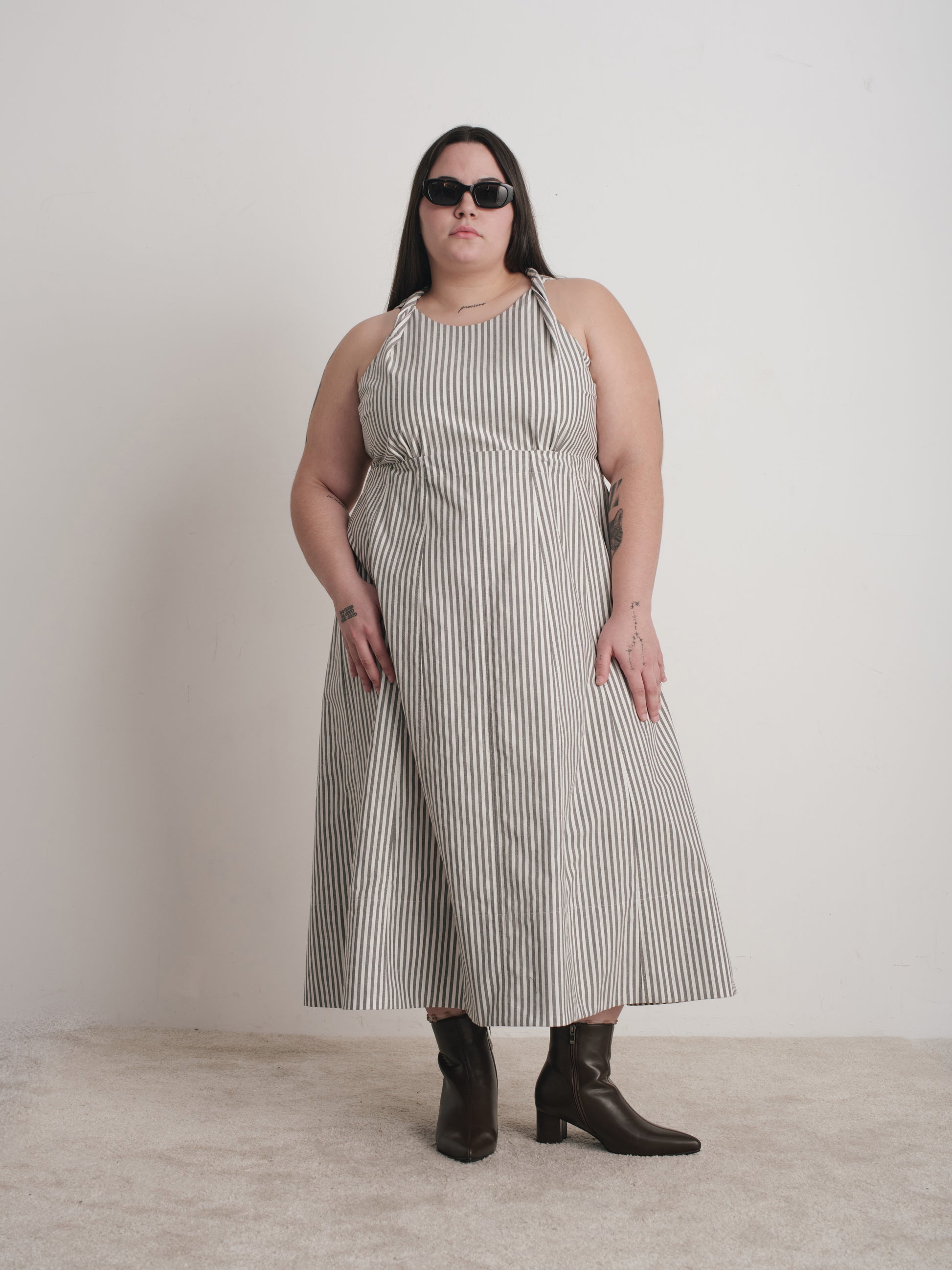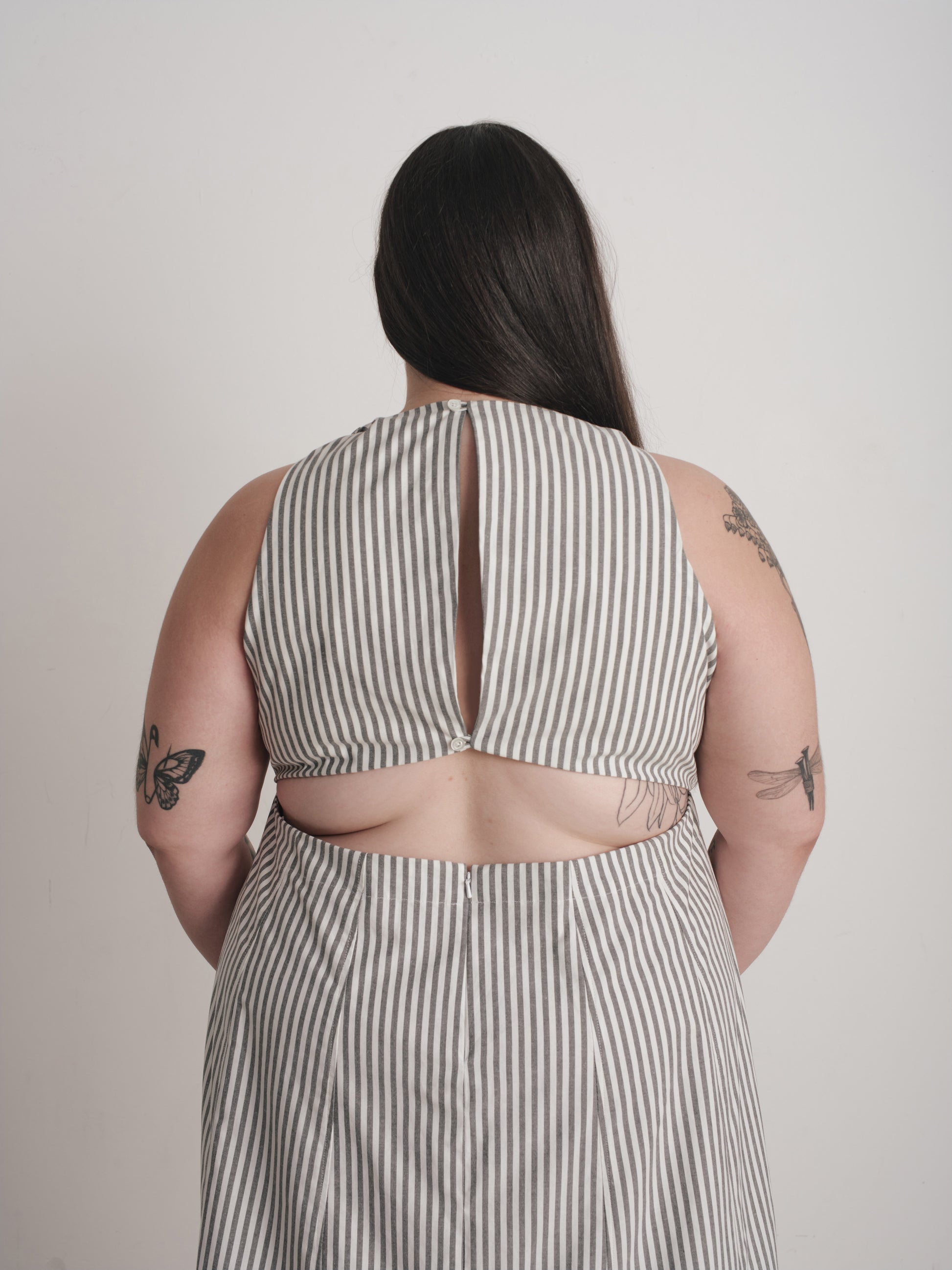 Polished in the front, party in the back..literally. The Steely is the kind of dress you don’t have to overthink and works for a bevy of occasions; last minute dinner plans, a summer wedding or just a Tuesday when you’re feeling bold. It has subtle twists at the shoulders with a revealing back and a lot of topstitching.