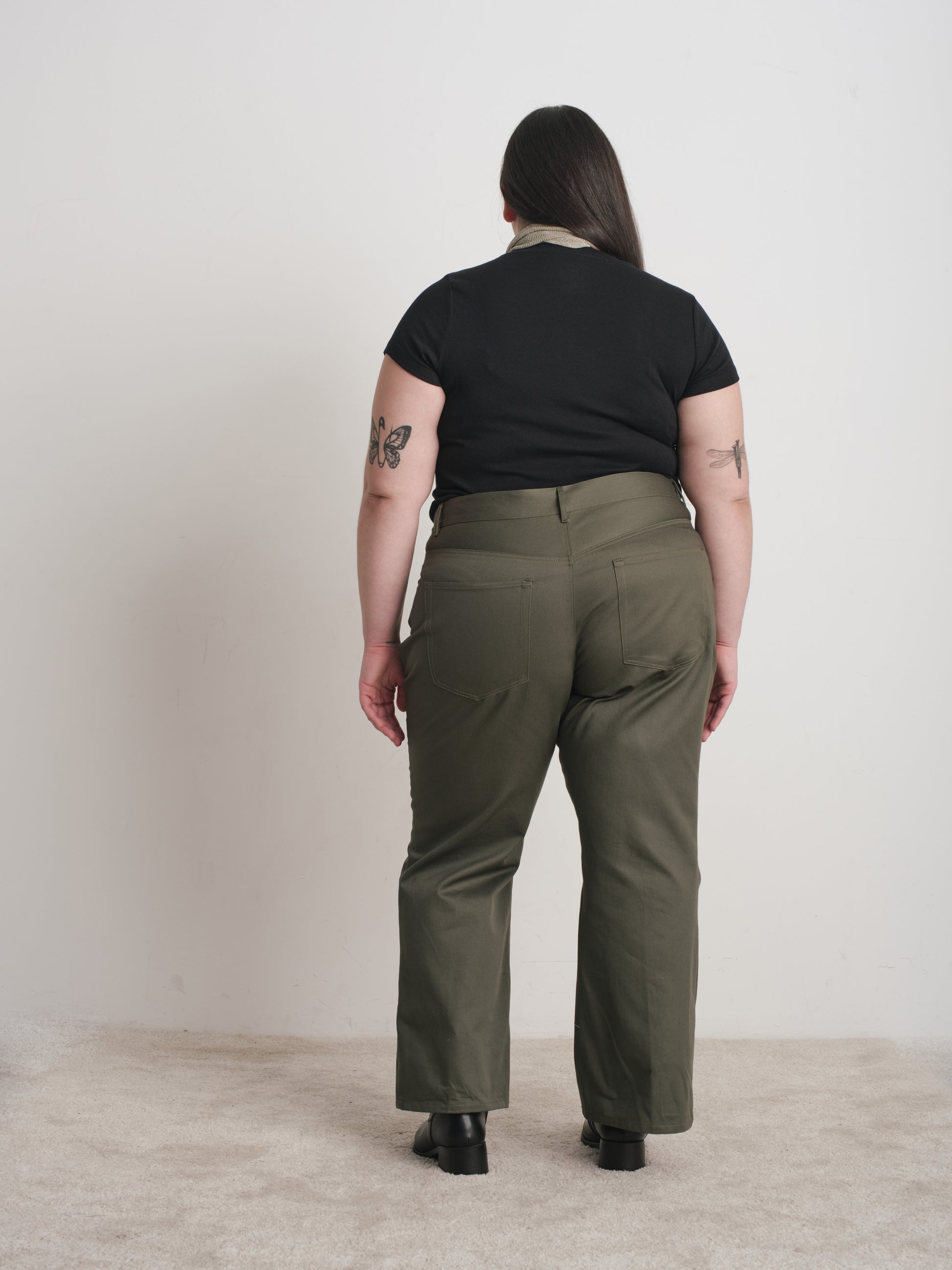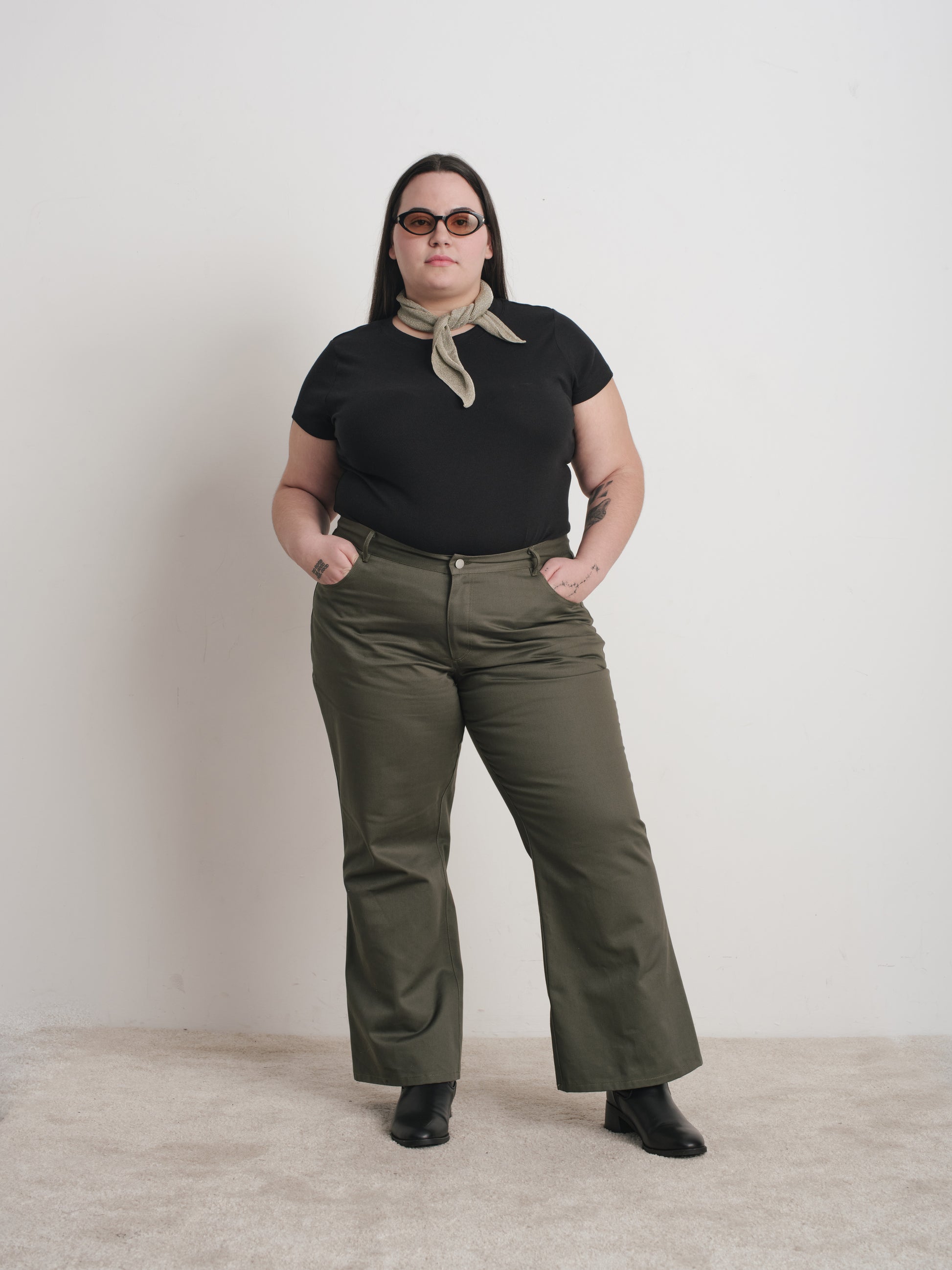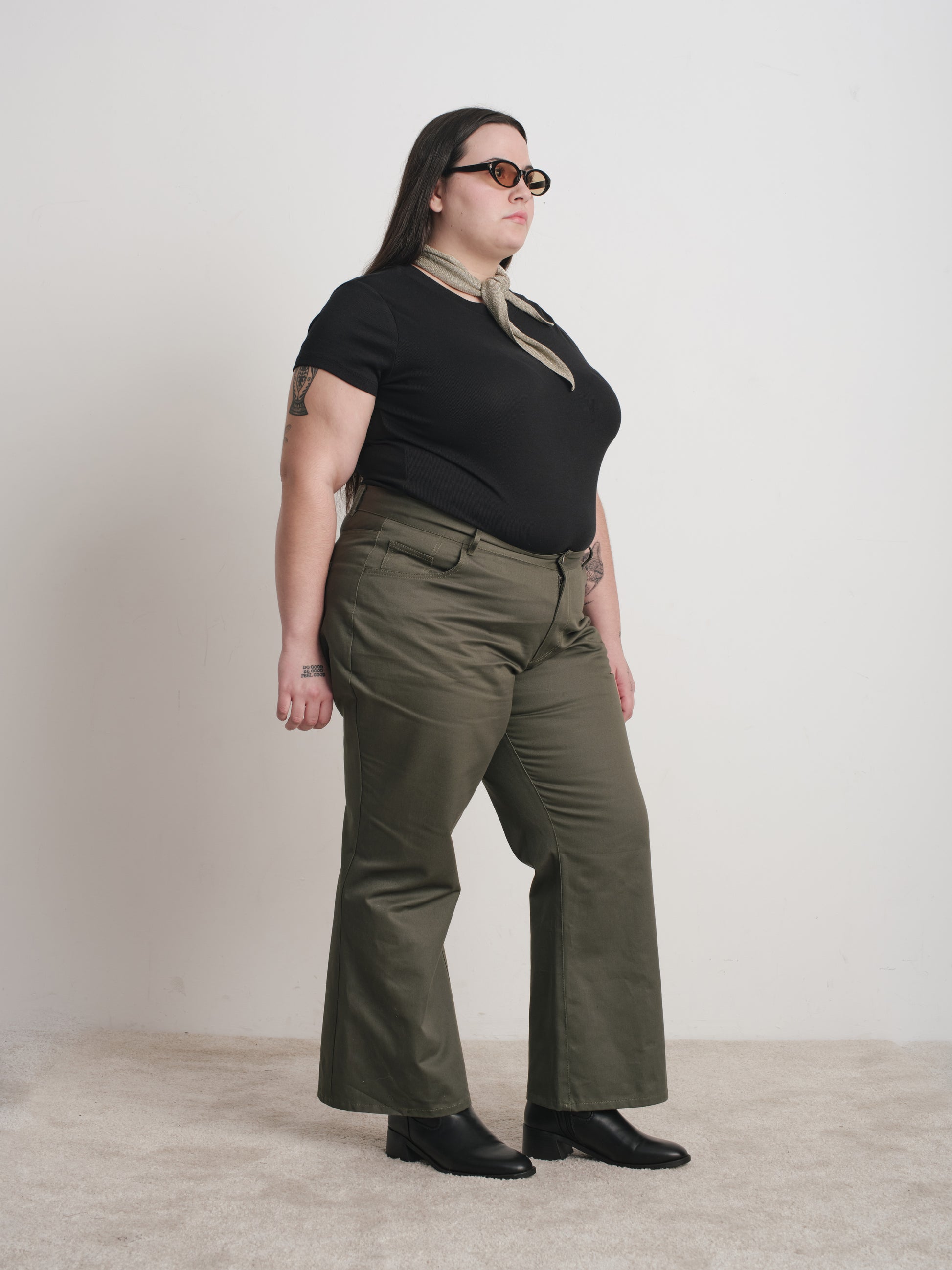 Malak is wearing View A in a size 4 from the DD size range in a 12oz Raw Denim in color Indigo. She is wearing View B in 10oz Bull Denim from Fabric Wholesale Direction in color Black. Her measurements are; 34"/26"/37" at 5'8".